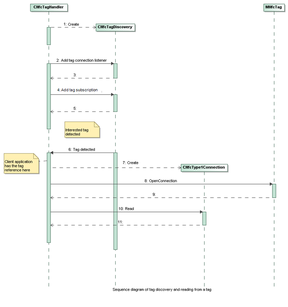 The sequence diagram below illustrates how reading from a tag works: