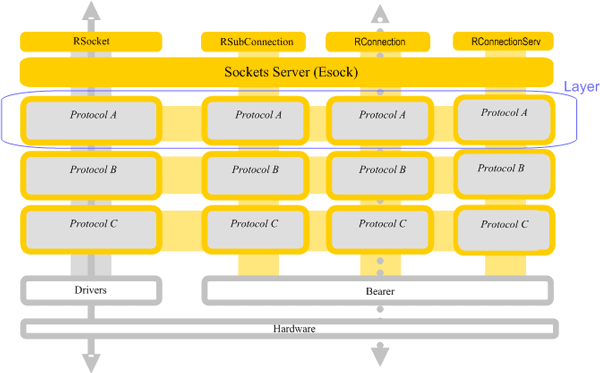The number of Layers only depends on the configuration of the Communications Stack. The top Layer has the Sockets Server. The bottom Layer has the drivers for the communication hardware . Each Layer interacts only with the Layer immediately above and the Layer immediately below.