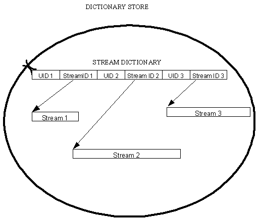 A dictionary store contains streams in the usual way but, in addition, the root stream is a stream dictionary. That is, the external representation of a CStreamDictionary object is a list of two-way associations between UIDs and stream ids.