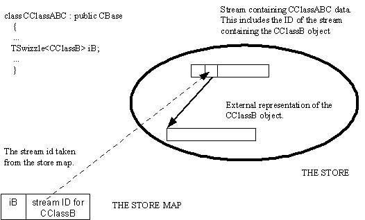 For example, given a container type object, CClassABC, with a data member TSwizzle<CClassB> iB representing a CClassB object in memory, the diagram below illustrates the result of storing the container object.