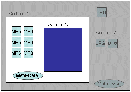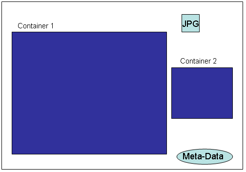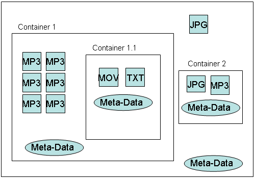 An archive file contains content objects and other containers within the file. Each container within the file may contain more content objects or further containers. Common examples of archive files are zip and tar files.
