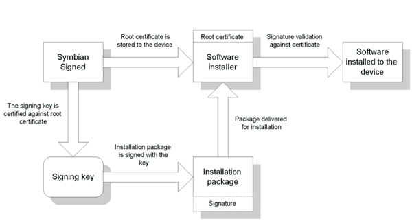 The Symbian Software Installer uses digital signatures and certificates to authenticate that the application being installed on a mobile device is from a known vendor. The signature can be obtained through the Symbian Signed process, and the default certificates installed in the mobile device act as root certificates. During installation the signature is validated against the certificates. If they match, the application is installed and the requested capabilities are stored in the executable, assuming that the root certificate can grant the capabilities. Only user capabilities can be granted to unsigned or self-signed applications, and these are always confirmed by the user.
