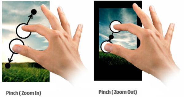 Moving the touch points (directly) closer to each other is recognized as pinch in. Application can use it, for example, for zooming out a picture. The behavior should be in relation to the speed and size of the stroke.