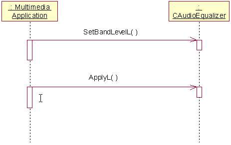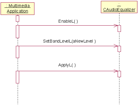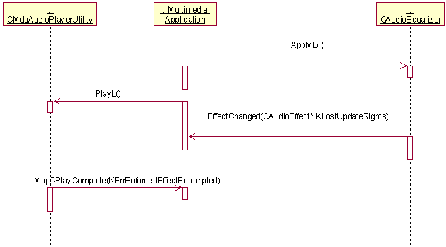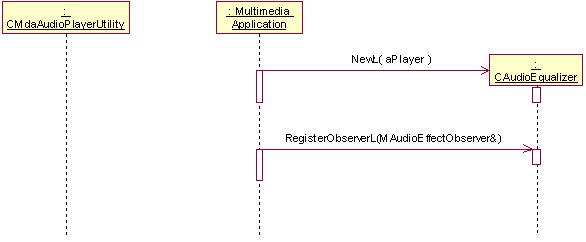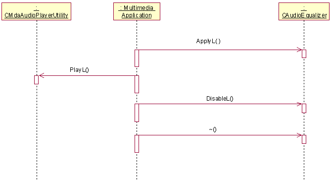 This example shows how a client audio application uses the equalizer effect. Note that an MDA Player utility must be created first and must not be deleted before the equalizer effect is deleted. The following steps and diagrams illustrate the stages of the equalizer effect lifecycle. All effects have similar sequences while their operations and events may be different.
