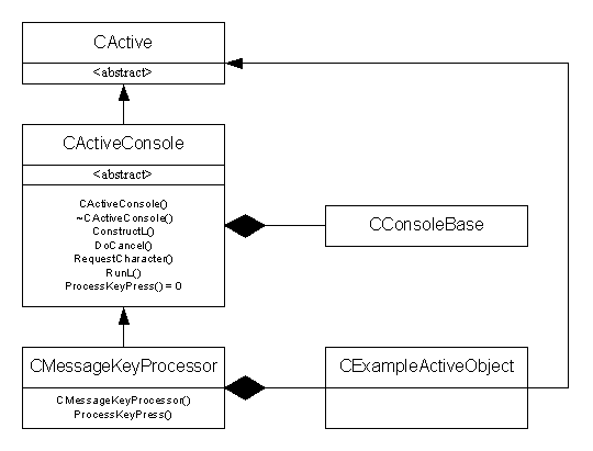 CMessageKeyProcessor is further derived from CActiveConsole and contains a pointer to another active object CExampleActiveObject, which requires input from the keyboard.