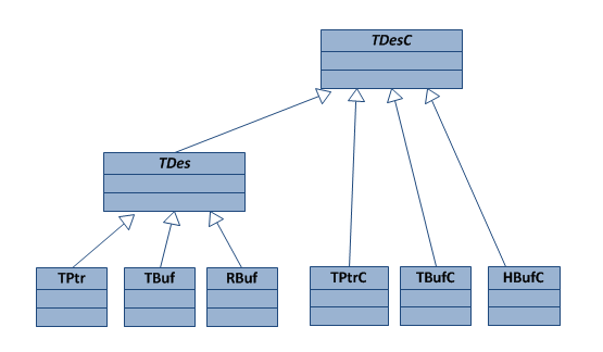 descriptor classes (TDesC16 and TDes16) and six concrete classes (TPtr16, TBuf16, RBuf16, TPtrC16, TBufC16, and HBufC16).