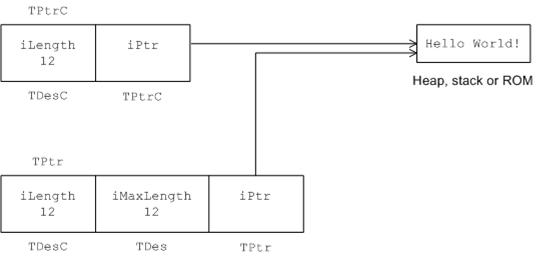 Figure: Memory layout of pointer descriptors TPtrC and TPtr