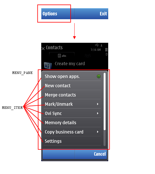 Access to menus is provided through the Options Menu API. For more information on Options Menu API, see Symbian C++ API specifications..