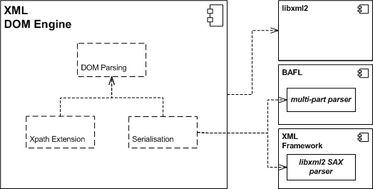 The following package diagram summarises the dependencies of the XML DOM Engine and shows the three functionality groups that are described in the following section.