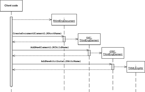 The following diagram shows a sequence of calls that create a DOM tree from an empty document. There are many functions in the DOM Engine API that add nodes to a tree: refer to the reference documentation of the TXmlEngElement class for a comprehensive list.