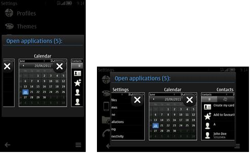 The Symbian Belle UI style allows multitasking (that is, working with more than one application simultaneously). To accomplish this, an application can be left running when switching to another application. It is possible to swap between running applications and interact with them.