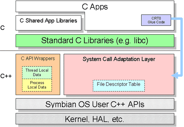 The diagram below shows how the Standard C libraries and exported applications fit into the native platform.