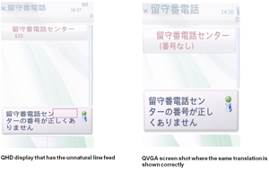 The text is incorrectly wrapped since "ー" is not allowed at the beginning of the line in Japanese and to avoid the situation, the forced line feed character (\n) has been inserted before ”タ" to correct the situation. However, since the translations should support both QVGA and QHD displays, the solution is not sufficient.