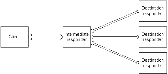 The client does the work of sending each request to the appropriate responder. The client collates the responses received. The following figure shows the interaction between the client and multiple destination responders.