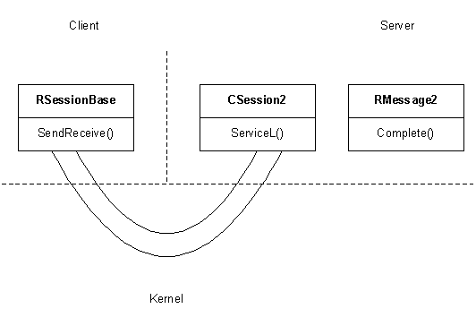 • The client sends the message to the server using RSessionBase::SendReceive(). This call eventually returns with the completion code.