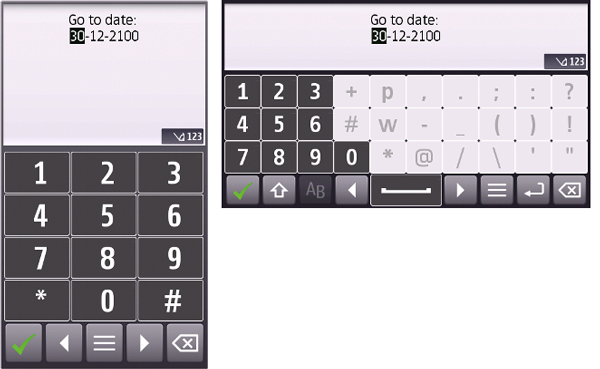 In addition to data query content, it has Backspace button and ITU-T keypad buttons. Softkeys are also displayed as buttons next to the editor, instead of Control pane. This component is used for (PIN, PUK, time and date) queries in start-up, and also in password editors.