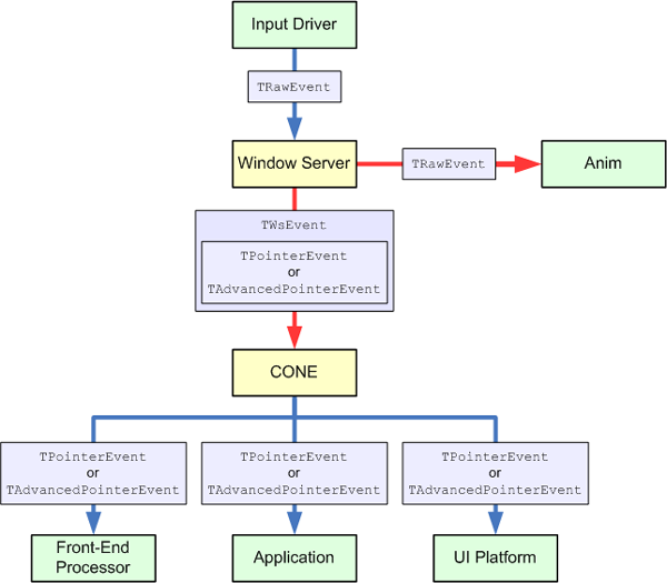 Pointer-related events move from the driver to the application. The TRawEvent, TWsEvent and TPointerEvent classes encapsulate the event information.