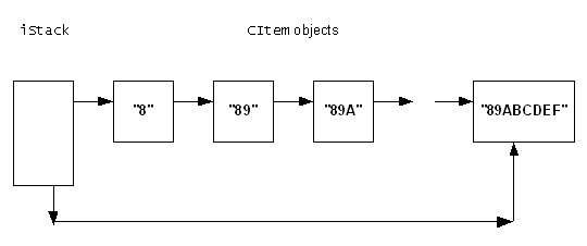 The stack is implemented by an instance of the example class CStack. This maintains the stack by adding CItem objects onto the end of the list and removing them from the end of the list. When removing them from the end of the list, a pointer to the removed CItem object is returned.