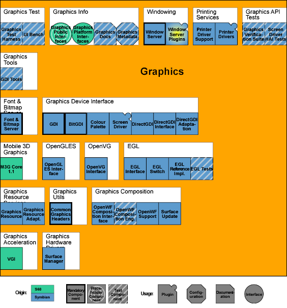 The Graphics package provides Symbian devices with a means of visual communication. It is responsible for providing a system-wide interface with the physical display(s) and handles input events from physical input devices such as keypads and touch screens.