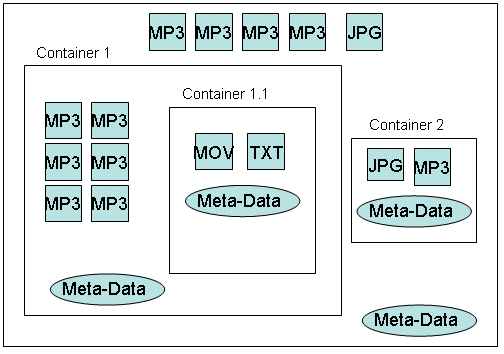 The content and meta-data may also be arranged in a hierachy with container objects grouping content objects together. A typical archive can have a complex structure as the example shown below: