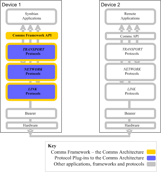 Figure: The Comms Architecture shown in the scope of a complete protocol stack and the end-to-end path between the applications on each device.