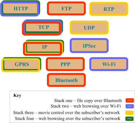Figure: Example of several potential stacks of protocols reusing the same protocols.