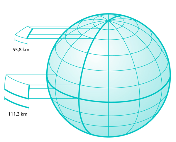 As seen in the figure below, latitude lines are smaller near the poles. At the equator, one degree of longitude is roughly 111.3 km, whereas at 60 degrees of latitude one degree of longitude is only 55.8 km, which is more difficult to see.