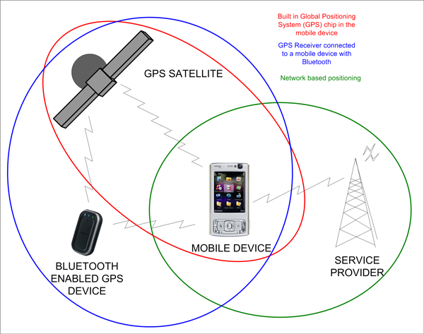 The above figure illustrates how the location information can be provided to the device. Access to these location methods is provided through the positioning modules.