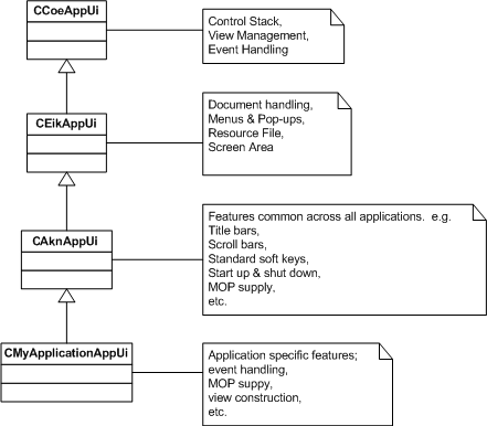 CCoeAppUi is the at the top of the run-time control hierarchy. It is the point at which key-press events are received from the Window Server. Many of the event-handling functions are virtual and implemented in the derived AppUi classes.