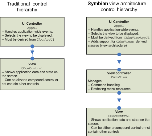 Figure: Controller-view hierarchy in traditional and Symbian architectures