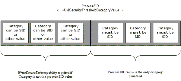 The KUidSecurityThresholdCategoryValue value effectively forms a threshold value. Processes with a SID value below this threshold can define a category that is different from their SID, provided they have the WriteDeviceData capability. Processes with a SID value above this threshold value can only define a category that is the same as the SID - regardless of capability.