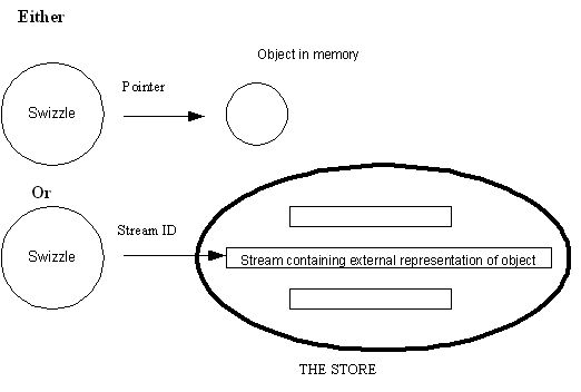 A typical container type object, therefore, does not have a pointer directly to a contained object, but has a Swizzle which can represent that contained object either as a pointer or as a stream ID, as illustrated in the following diagram.