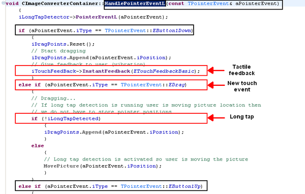 • Optional TPointerEvent::EDrag() for receiving events indicating that a mobile device user is dragging it across the screen.