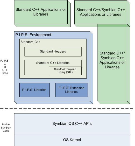 The following image illustrates how Standard C++ interacts with the Symbian platform and P.I.P.S. libraries: