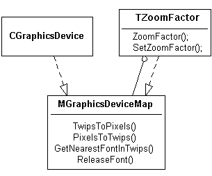 TZoomFactor also implements this interface. It takes a mapping between twips and pixels, and then also applies a zooming factor: the larger the zooming factor, the more pixels per twip. The relationship between the classes is shown below: