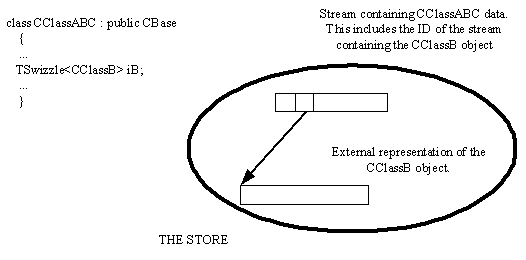 The Swizzle must represent the CClassB type object as a pointer, i.e. the swizzled object must be in memory. The operator-> applied to the Swizzle iB gives access to the StoreL() member function of the CClassB object.