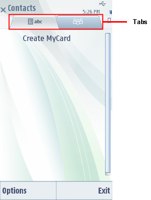 The Symbian UI supports tabs, which allow you to collect information for a state onto different pages. These tabs exist in the same node of the navigation hierarchy. The concept of tabs is related to the term view.
