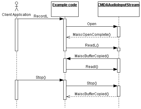 To record the audio stream, use the ReadL() member function, specifying the buffer to use. The first ReadL() after a successful Open(), starts audio recording. Once the buffer is successfully recorded, a pointer to it is returned by MMdaAudioInputStreamCallback::MaiscBufferCopied() callback.