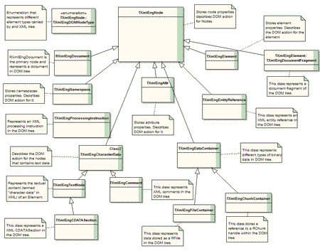 The following diagram describes all the node classes of the XML DOM Engine. Refer to the links below for more information about each class.