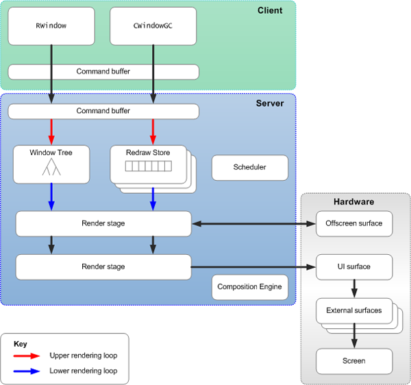 The upper loop is the process by which the Window Server’s scene state information is updated based on commands from the client. There are two types of scene state updates: window tree updates (such as when a window is moved) and redraw store updates (such as when new drawing operations are sent for a particular window).