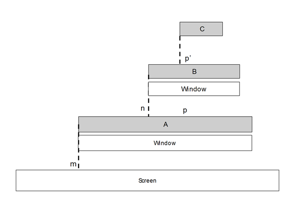 However, if B is a child control of A but also has a window of its own, it is a child window of A's window (as shown in the following figure). Then if C is a child of B and sets its window by calling CCoeControl::SetContainerWindowL(B), the position of C (p') is relative to B's window.