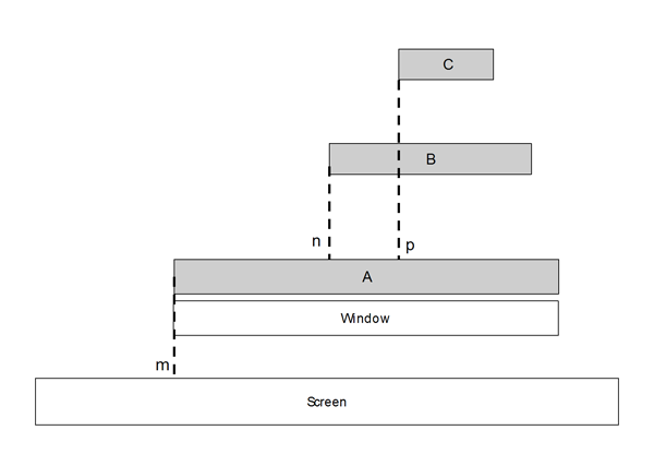 B's window is set calling the CCoeControl::SetContainerWindowL(A) method and C's window is set with CCoeControl::SetContainerWindowL(B). Then C's position (p) is relative to A, since it is the actual window owner. A's position (m) is relative to the display position.