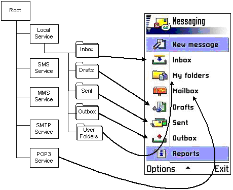 In the figure, you can see that the message centre has hidden the local service and shows the standard folders at the same level as the services. Also the SMTP, SMS and MMS services are marked as hidden entries in the Message Store, and so do not appear in the message application. The outbox does not retain copies of sent messages, but are saved in the Sent folder.