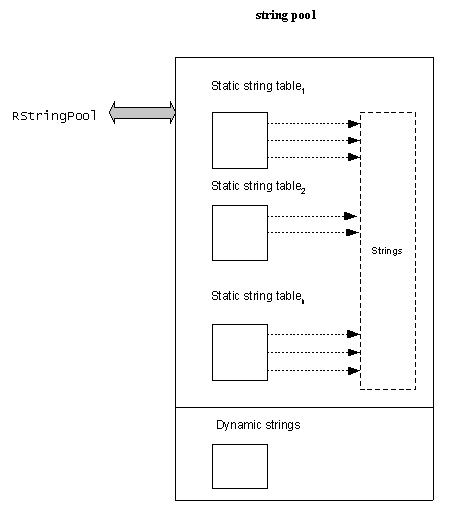 A string pool is referenced through an RStringPool, which is a handle like object. The following diagram illustrates the basic idea:
