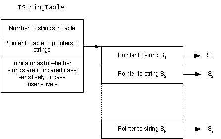 The following diagram illustrates a general picture. Note that the strings in any given string table are deemed to be either case sensitive or case insensitive, and this governs how comparisons are made.