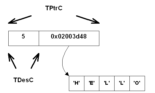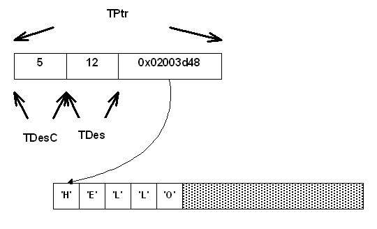 The base class, TDesC, contains a data member which holds the length of the data. The following drawing shows the layout of a TPtrC object for a string of five characters representing the English word "Hello".