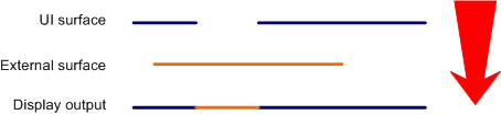 The following diagram provides a cross-section view through the surfaces shown in the previous figure. Notice that the UI surface is the topmost layer and that it contains a hole through which the external surface can be seen.