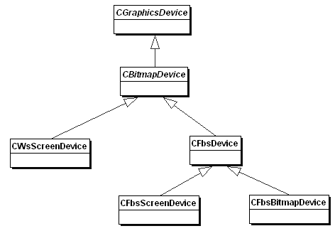 The Window Server client-side API provides one implementation, CWsScreenDevice, for screen drawing. Another implementation, CFbsBitmapDevice, is used for drawing to in-memory bitmaps. A third, CFbsScreenDevice, is used (rarely) to access the screen directly, without the mediation of the window server.