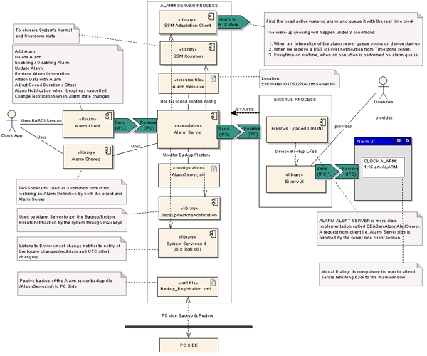 It allows clients to query the status of alarms, set alarms, remove alarms and perform other utility functions. The Alarm client API allows other components to interact with the Alarm Server. The Alarm Server sends notification of alarm expiry to the Alert Server, which then notifies the Alarm UI to display dialogs and play sound.