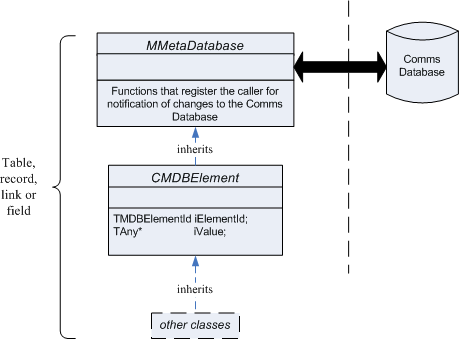 All elements that you can read and write have the class [[[ERROR: [NOKX000E] Unable to find definition for key reference 'CommsDat']]]MMetaDatabase as a base class. This base class contains the functions that allow the CommsDat API to notify tools and applicaions of changes to the database.